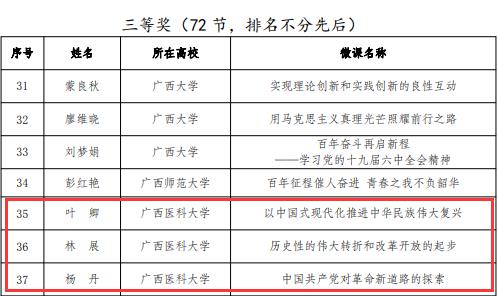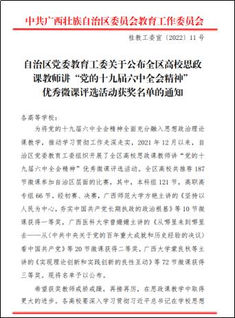 近日,自治区党委教育工委公布了全区高校思政课教师讲“党的十九届六中全会精神”优秀微课评选活动获奖名单,学院教师喜获相关奖项4项,其中二等奖1项、三等奖3项。