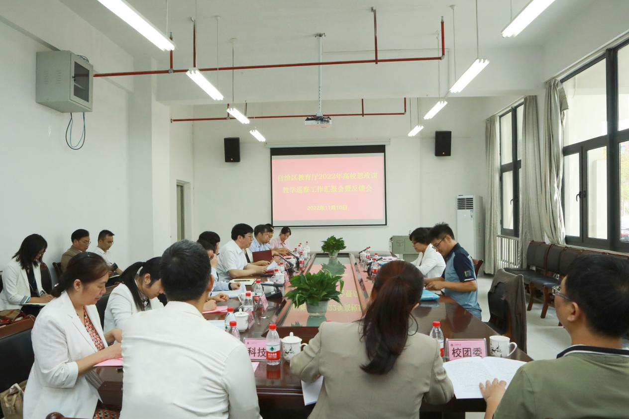 11月10日上午,桂林理工大学马克思主义学院梁英院长、南宁师范大学马克思主义学院徐广东教授、广西民族大学马克思主义学院覃青必教授组成的巡察组一行到我校检查思想政治理论课建设情况。学校党委书记黄照权、相关职能部门负责人、马克思主义学院领导班子和教师代表参加汇报会和反馈会。会议由学校党委宣传部王宇清部长主持。