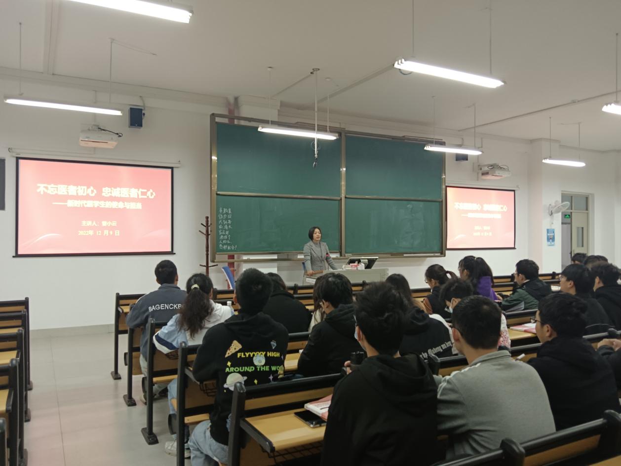曾小云副校长以“不忘医者初心 忠诚医者仁心——新时代医学生的使命与担当”为题目,结合医学专业知识、运用典型的事迹和身边鲜活的案例,为同学们带来了一堂生动而深刻的思政课。课堂内容丰富、逻辑清晰、语言生动,深入阐述了习近平总书记在党的二十大报告中对青年的殷切期望,从“感动中国”的医者到“我们身边的健康守护者”,以多个典型人物和事迹勉励同学们要锤炼人生“四力”:原动力、竞争力、耐久力和爆发力,提升医学生的“五术”:救死扶伤的道术、心中有爱的仁术、知识扎实的学术、本领过硬的技术和方法科学的艺术,最后她鼓励同学们说:“同学们身处盛世,赶上了一个新时代、好时代,一个时代有一个时代的历史使命任务,一代人有一代人的历史责任担当。团结才能胜利,奋斗才能成功!希望同学们在奋斗中闪光,在未来中遇见更好的自己!为实现中华民族伟大复兴接续奋斗”。