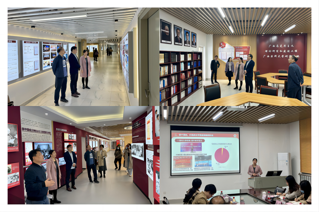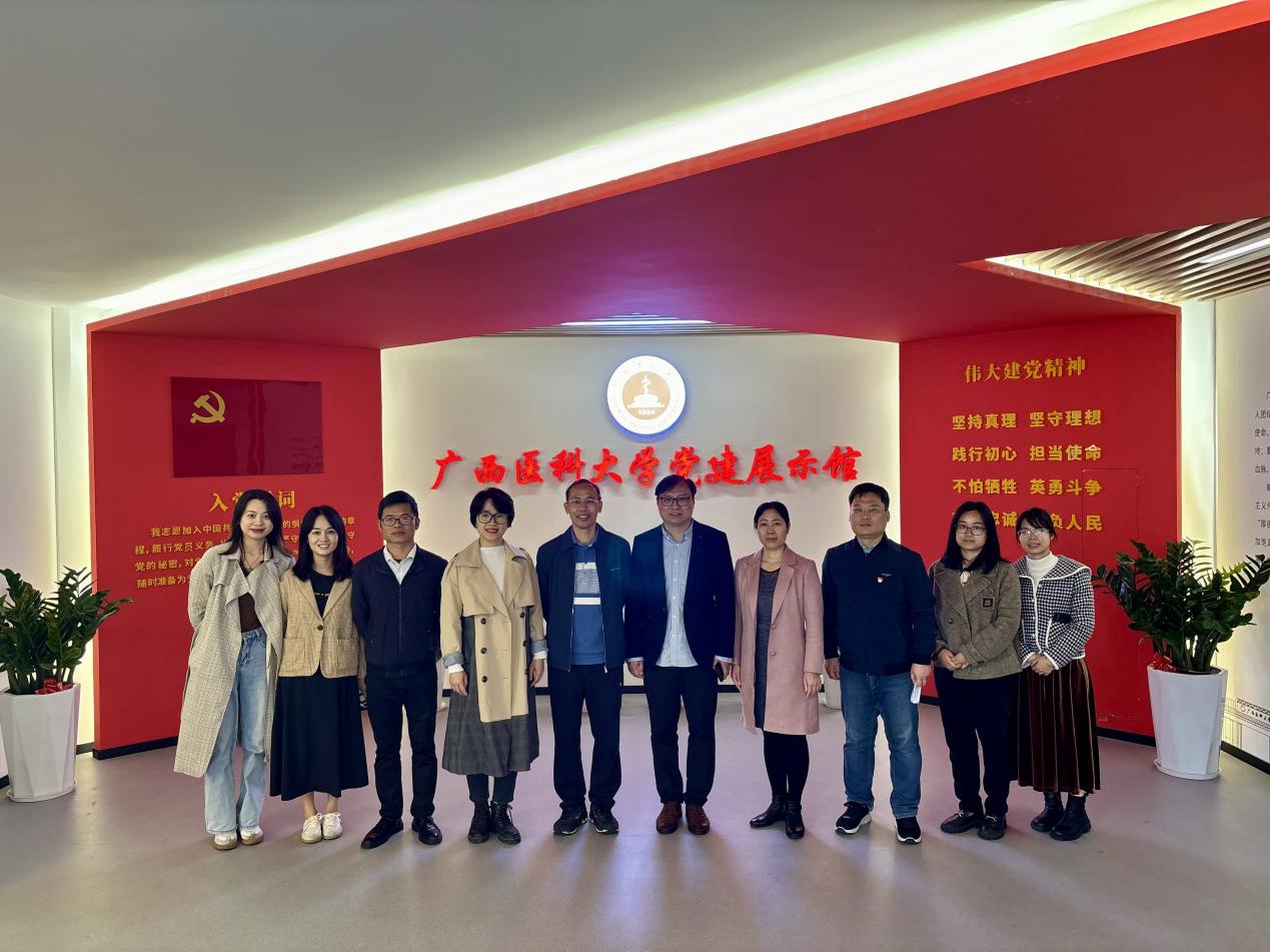 在交流期间,闫冰院长一行参观走访了马克思主义学院文化长廊、党建与思想政治教育虚拟仿真中心、广西医科大学党建展示馆等,就我校党建工作和文化建设工作进行实地考察。