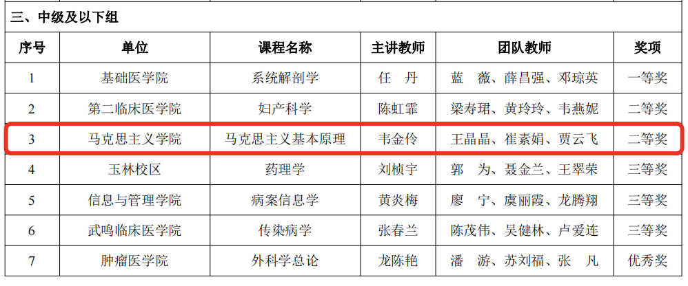 近日,学校公布第四届广西医科大学教师教学创新大赛获奖名单,马克思主义学院韦金伶教师团队主讲课程《马克思主义基本原理》荣获中级及以下组二等奖。