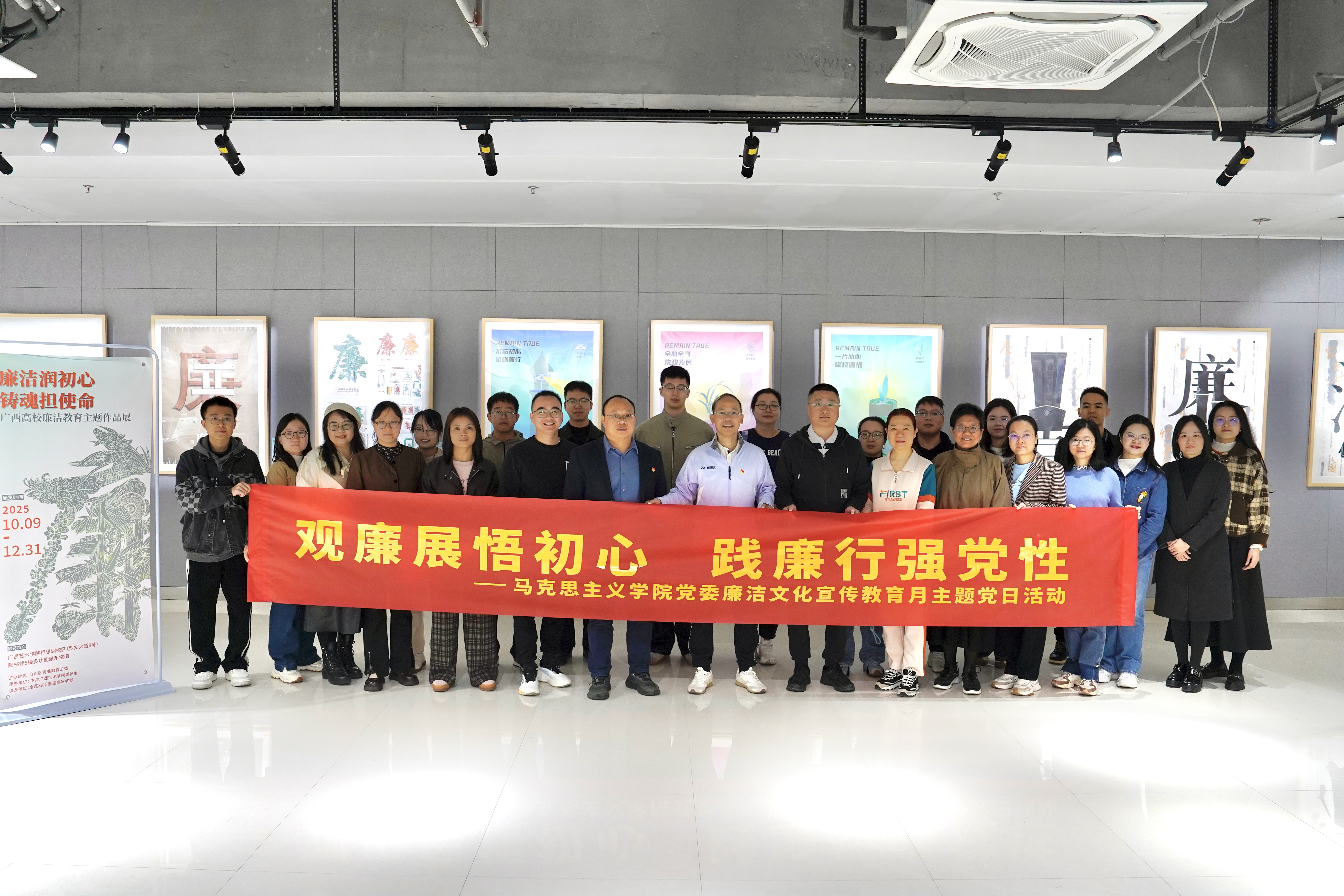 11月29日,马克思主义学院党委以“观廉展悟初心,践廉行强党性”为主题开展廉洁文化宣传教育月主题党日活动,学院领导班子成员及师生代表前往广西艺术学院相思湖校区图书馆5楼多功能展示空间,参观“廉洁润初心 铸魂担使命”——广西高校廉洁教育主题作品展。