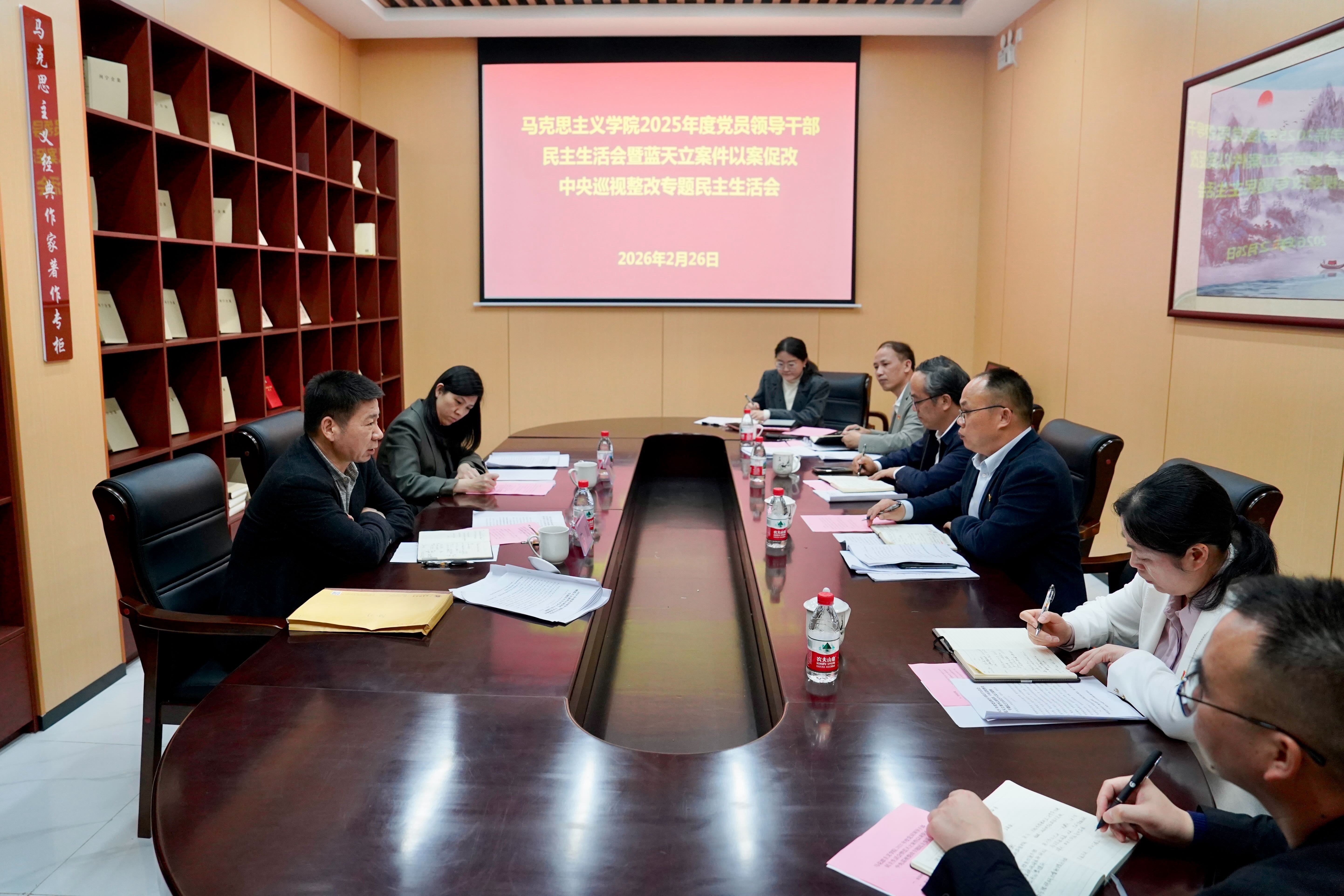 2月26日下午,马克思主义学院党委在校本部人文楼一楼102会议室召开2025年度党员领导干部民主生活会暨蓝天立案件以案促改、中央巡视整改专题民主生活会。学校党委书记陈川、学校党委组织部副部长徐榕到会指导。学院党委领导班子成员参加会议。学院党委书记陈会方主持会议,并作表态发言。